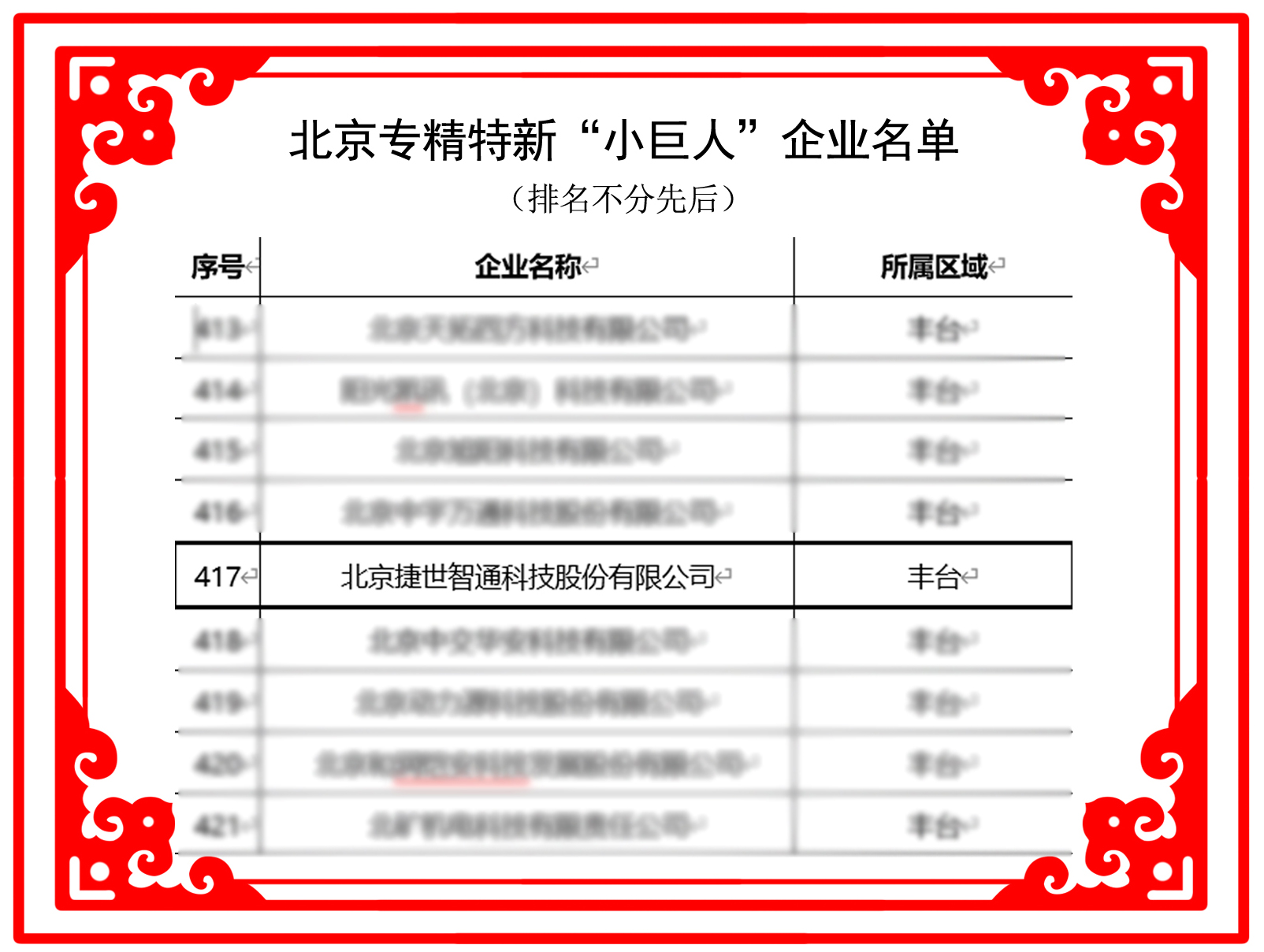 近期,北京市經(jīng)濟和信息化局公示了2021年度第二批北京市專精特新“小巨人”企業(yè)名單,捷世智通成功入選,榮登榜單。這是繼2021年度北京市專精特新企業(yè)認定后的再升級,是捷世虎年開局的精彩表現(xiàn)之一。
